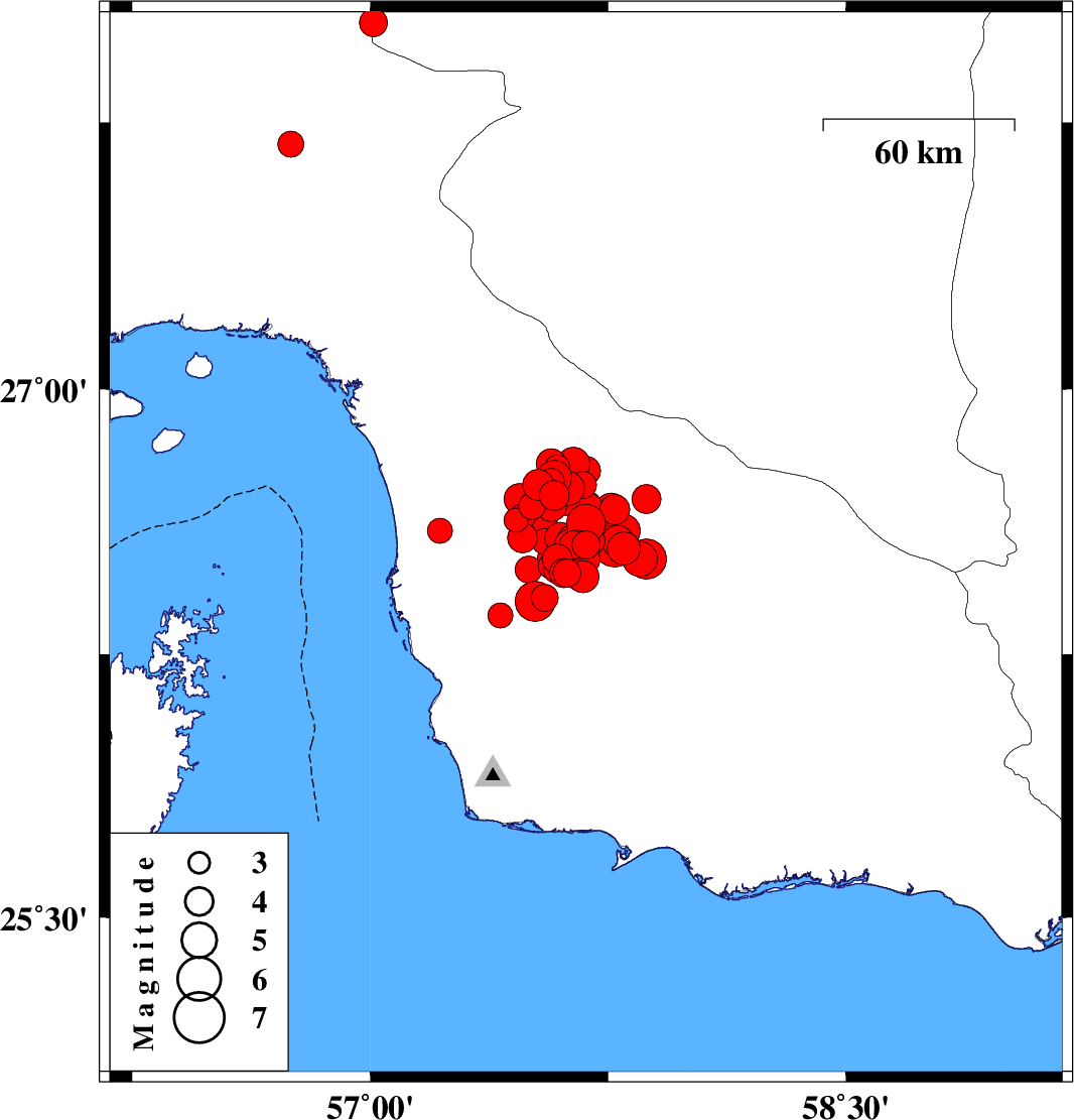 | 2013/05/11 | 03:09:48.1 | 07:39:48.1 | 26.52 | 57.87 | 15 | Ms5.7 | Hormozgan Province, 99 km North-East of Jask | ||