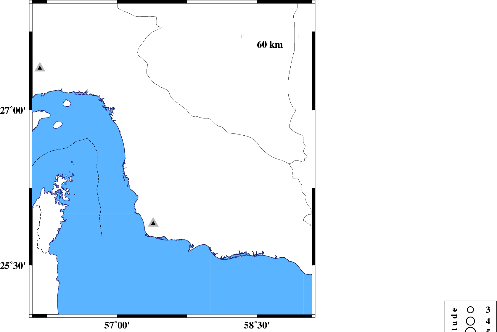 | 2013/05/11 | 03:09:48.1 | 07:39:48.1 | 26.52 | 57.87 | 15 | Ms5.7 | Hormozgan Province, 99 km North-East of Jask | ||