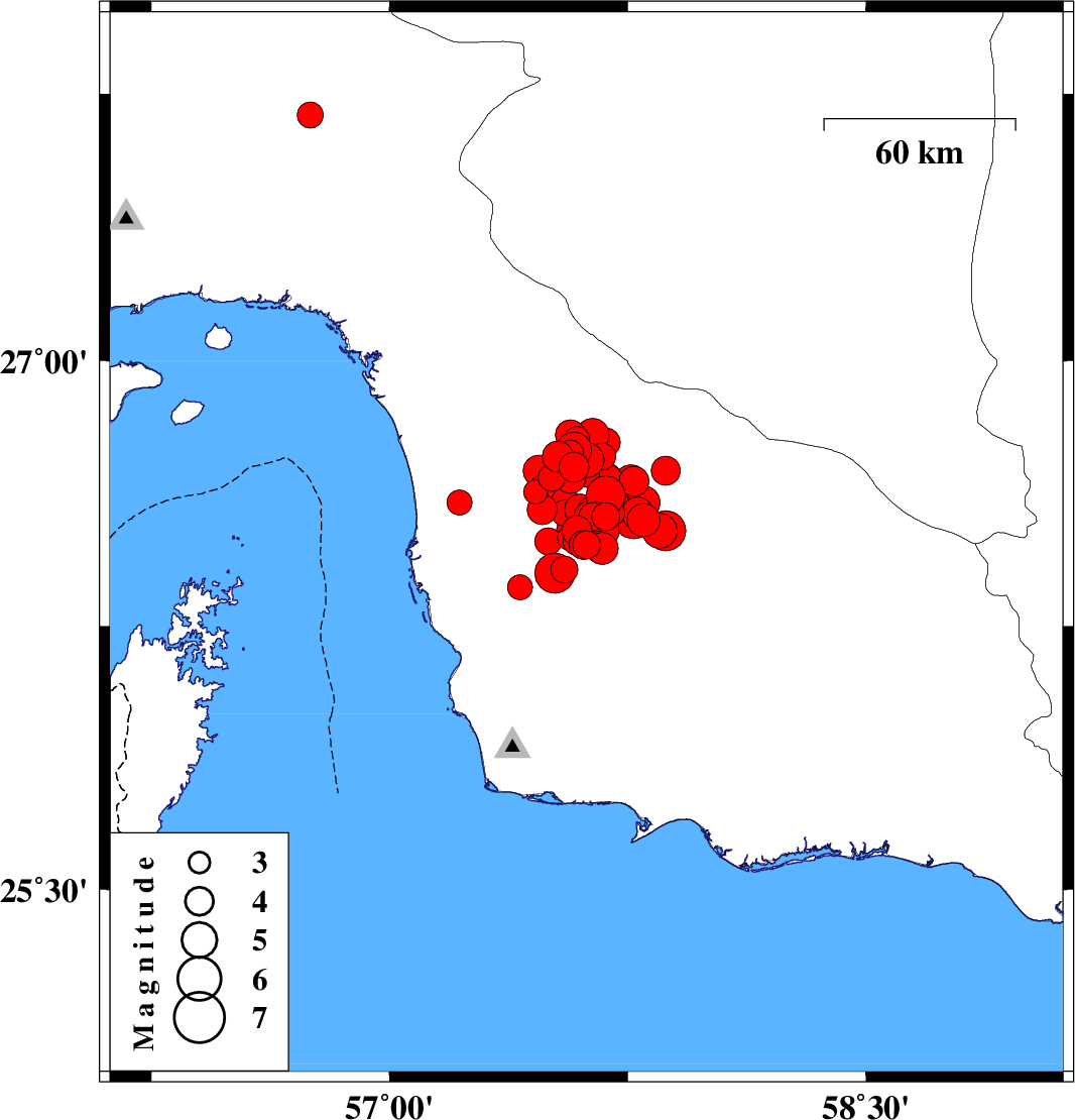 | 2013/05/11 | 03:09:48.1 | 07:39:48.1 | 26.52 | 57.87 | 15 | Ms5.7 | Hormozgan Province, 99 km North-East of Jask | ||