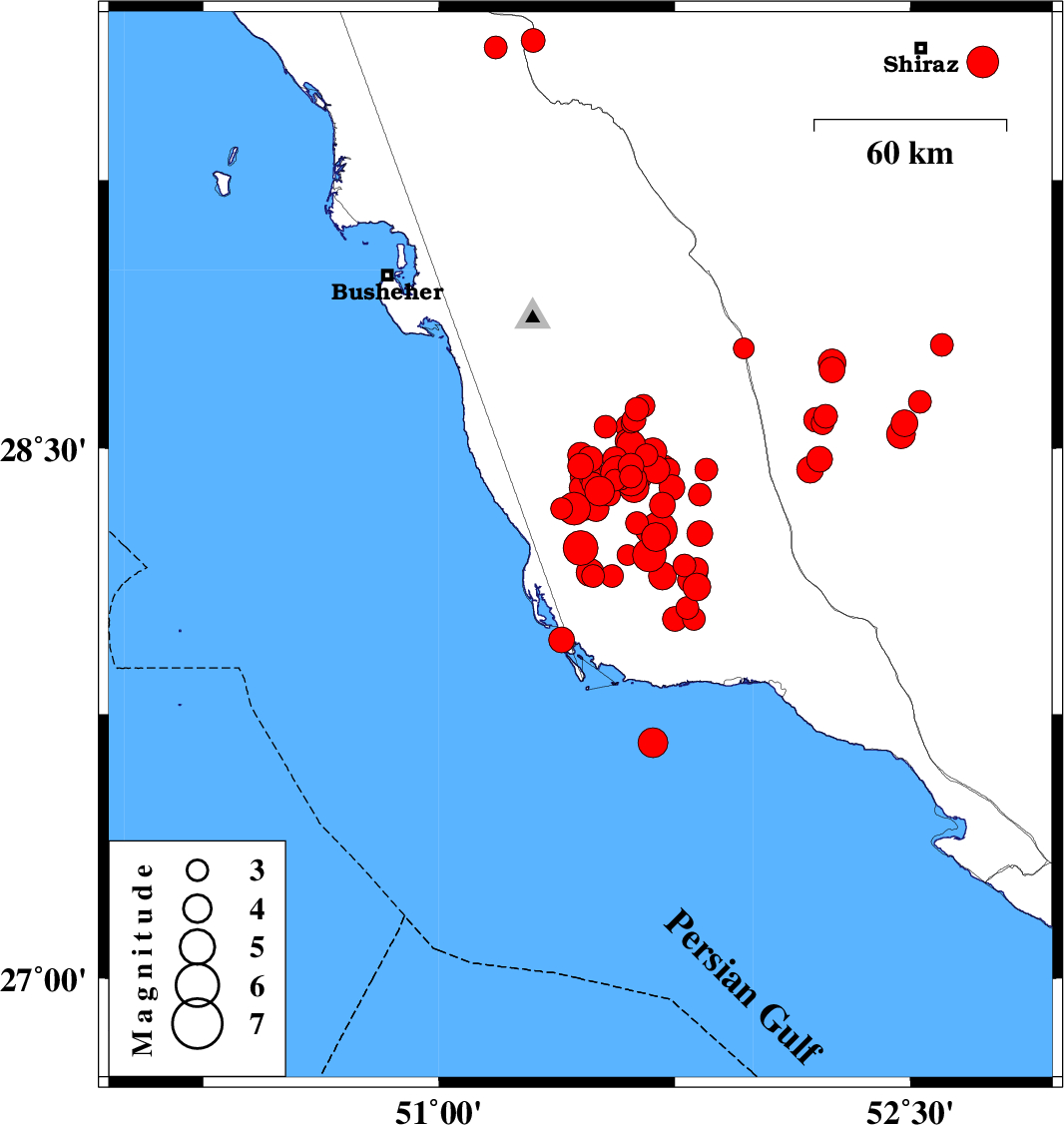 | 2013/04/14 | 05:21:49.2 | 09:51:49.2 | 28.49 | 51.68 | 17 | ML4 | Bushehr Province, 35 km South-East of Khormog | ||