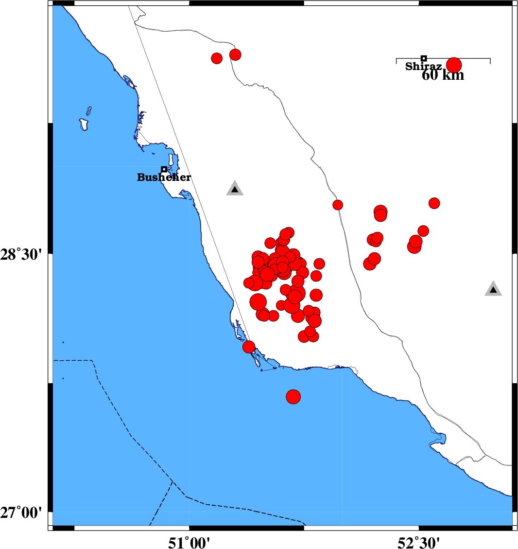 | 2013/04/19 | 18:32:57.5 | 23:02:57.5 | 28.42 | 51.49 | 29 | ML4 | Bushehr Province, 28 km South-East of Khormog | ||