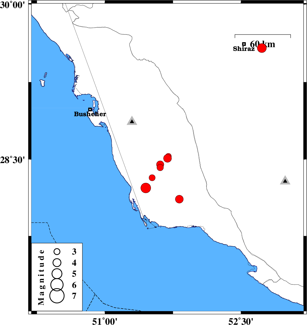 | 2013/05/09 | 03:29:37.2 | 07:59:37.2 | 28.11 | 51.82 | 31 | ML4 | Bushehr Province, 39 km North-West of Bandar-e kangan |