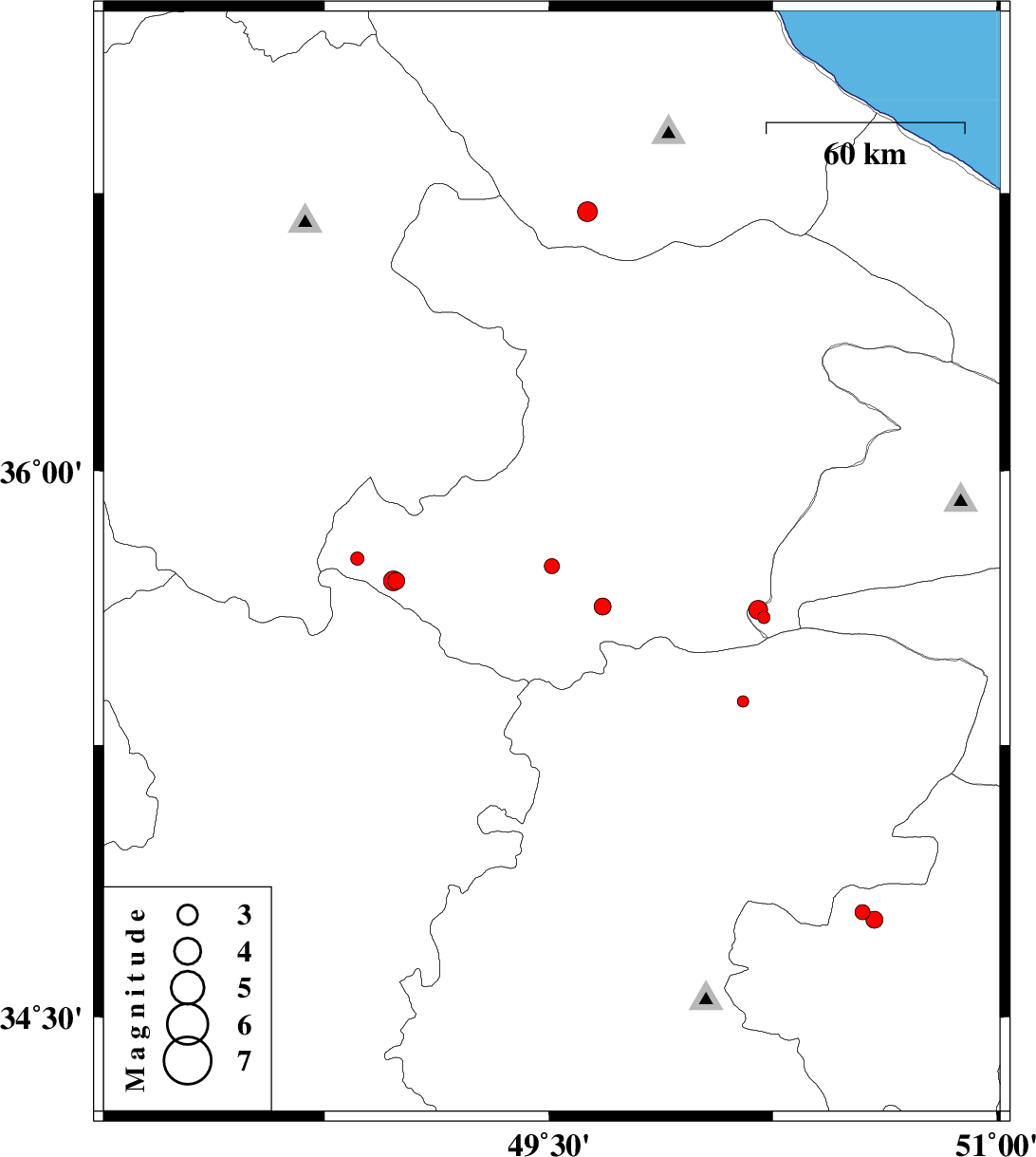 | 2013/05/02 | 09:20:16.6 | 13:50:16.6 | 35.37 | 50.15 | 14 | ML1.7 | Markazi Province, 45 km South of Buinzara | ||