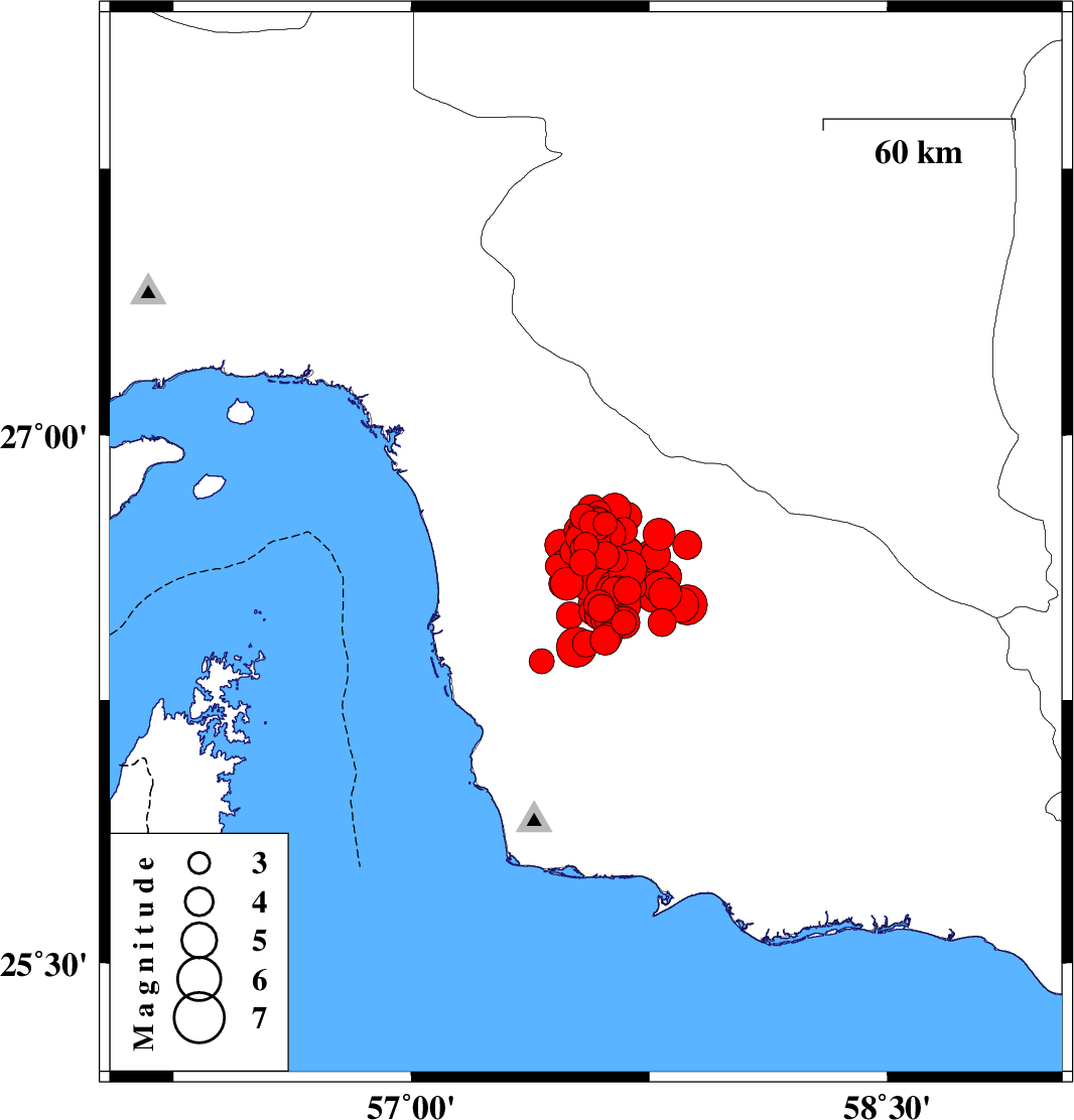 | 2013/05/11 | 03:09:48.1 | 07:39:48.1 | 26.52 | 57.87 | 15 | Ms5.7 | Hormozgan Province, 99 km North-East of Jask | ||