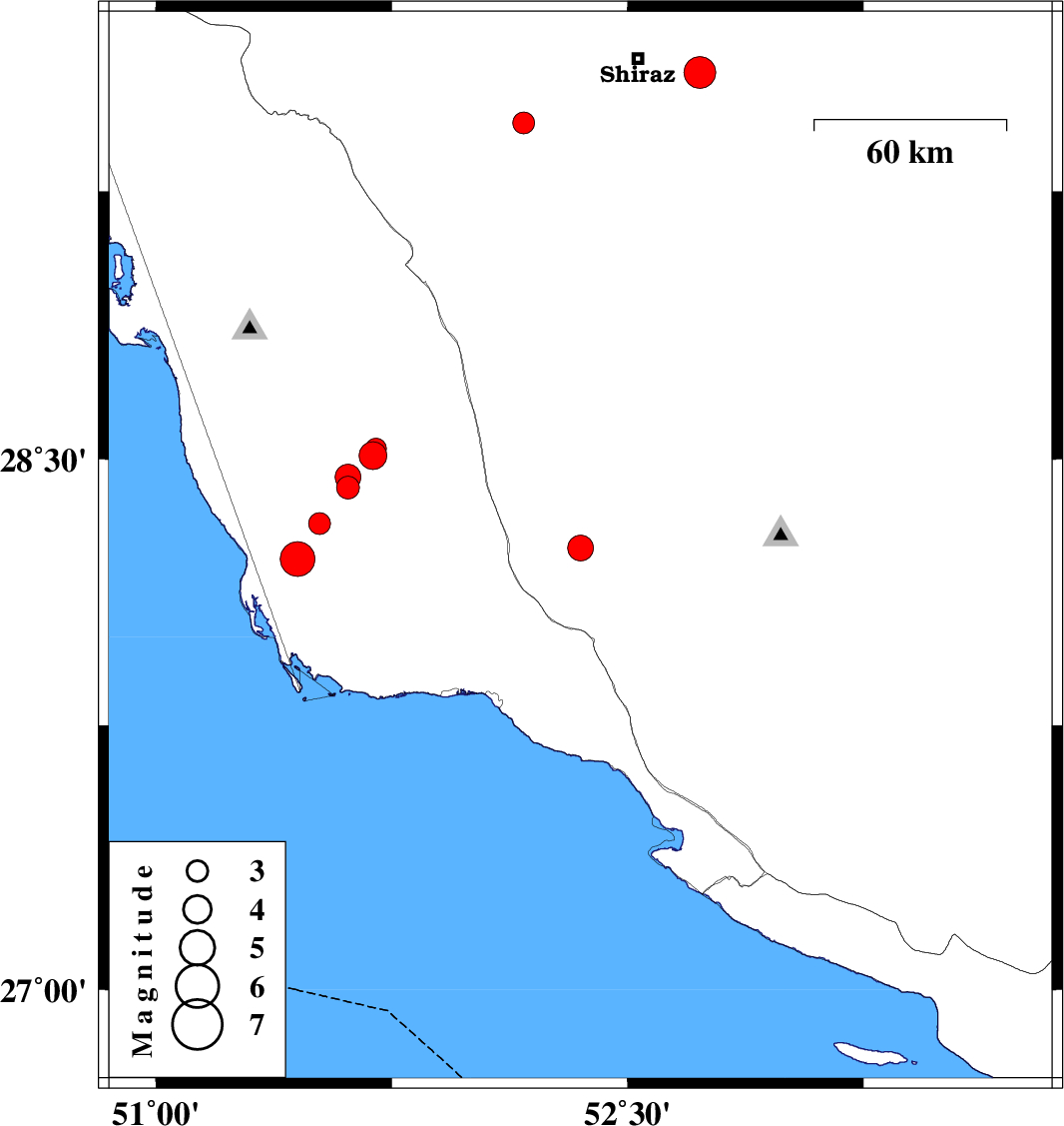 | 2013/05/12 | 02:37:04.3 | 07:07:04.3 | 28.45 | 51.61 | 24 | ML3.7 | Bushehr Province, 32 km South-East of Khormog |
