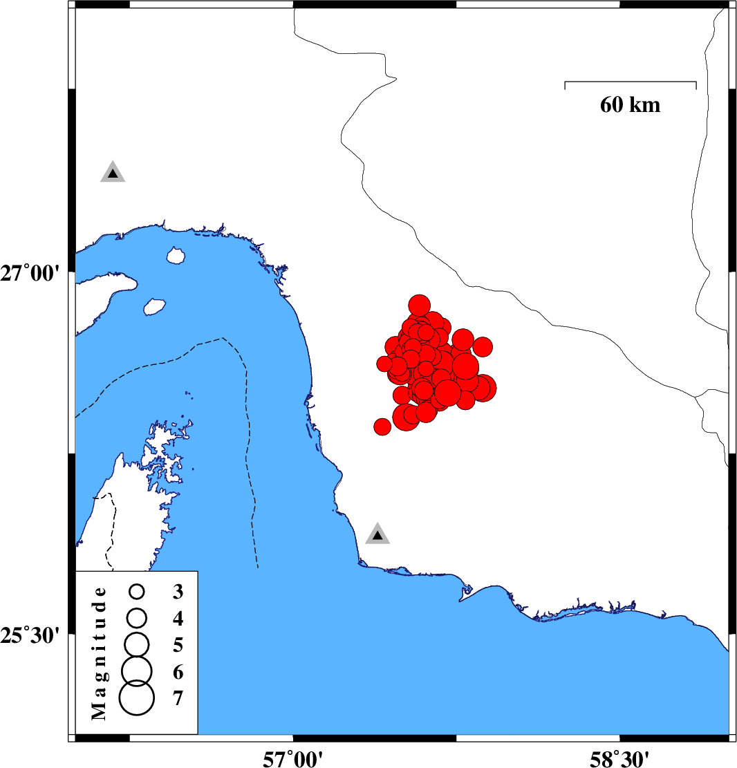 | 2013/05/11 | 03:09:48.1 | 07:39:48.1 | 26.52 | 57.87 | 15 | Ms5.7 | Hormozgan Province, 99 km North-East of Jask | ||