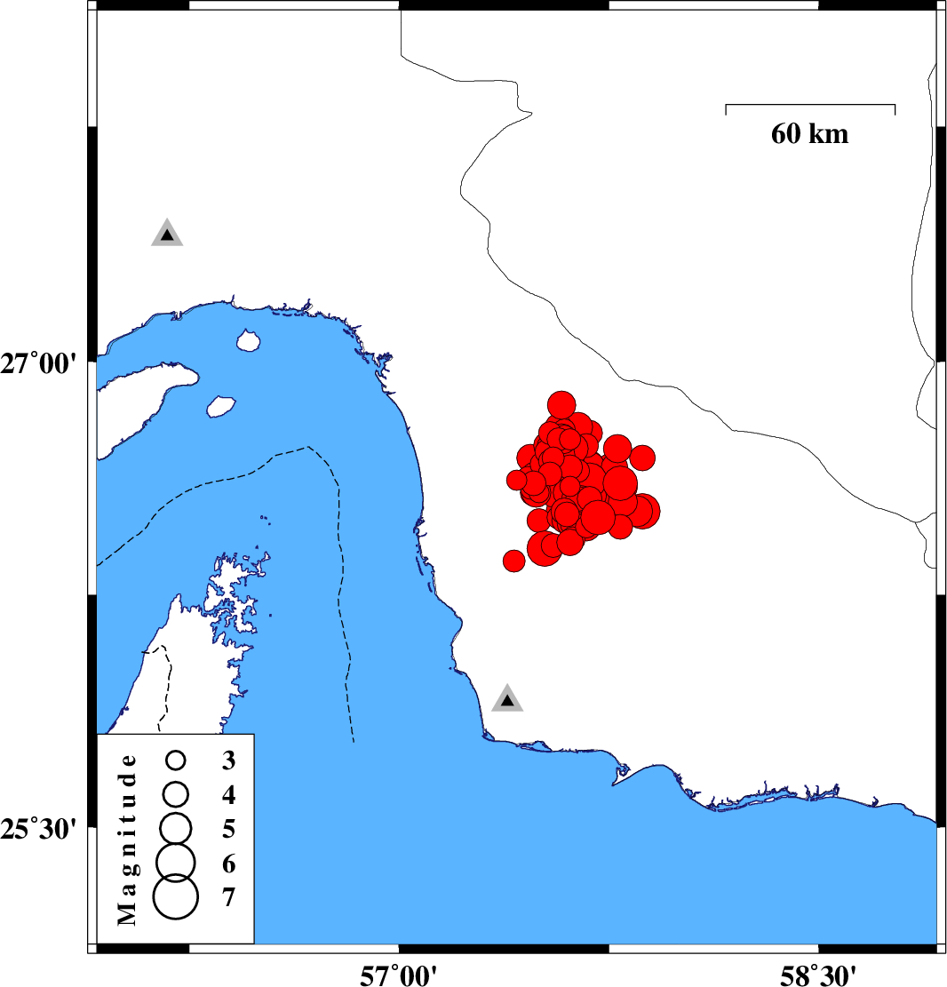 | 2013/05/11 | 02:08:08.5 | 06:38:08.5 | 26.56 | 57.77 | 15 | Ms6.2 | Hormozgan Province, 103 km North of Jask |