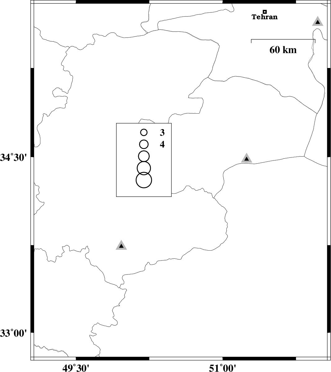 | 2013/05/20 | 09:46:55.1 | 14:16:55.1 | 34.11 | 49.75 | 27 | ML1.7 | Markazi Province, 6 km Arak | ||