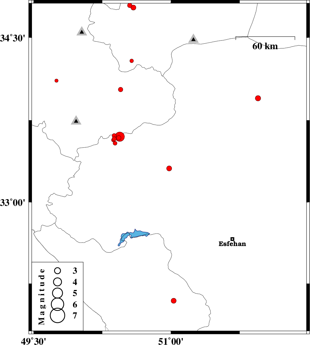 | 2013/04/28 | 12:40:36.8 | 17:10:36.8 | 33.95 | 51.95 | 18 | ML2.7 | Esfahan Province, 49 km North of Natanz | ||