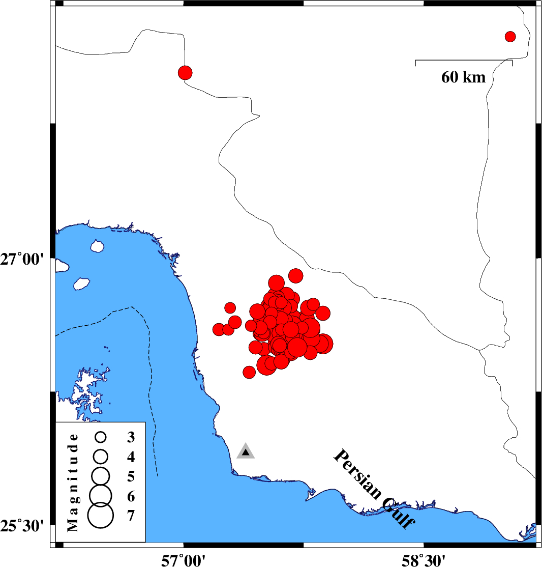 | 2013/04/25 | 07:48:58.5 | 12:18:58.5 | 28.03 | 57.01 | 14 | ML3.9 | Kerman Province, 68 km West of Kahnuj |