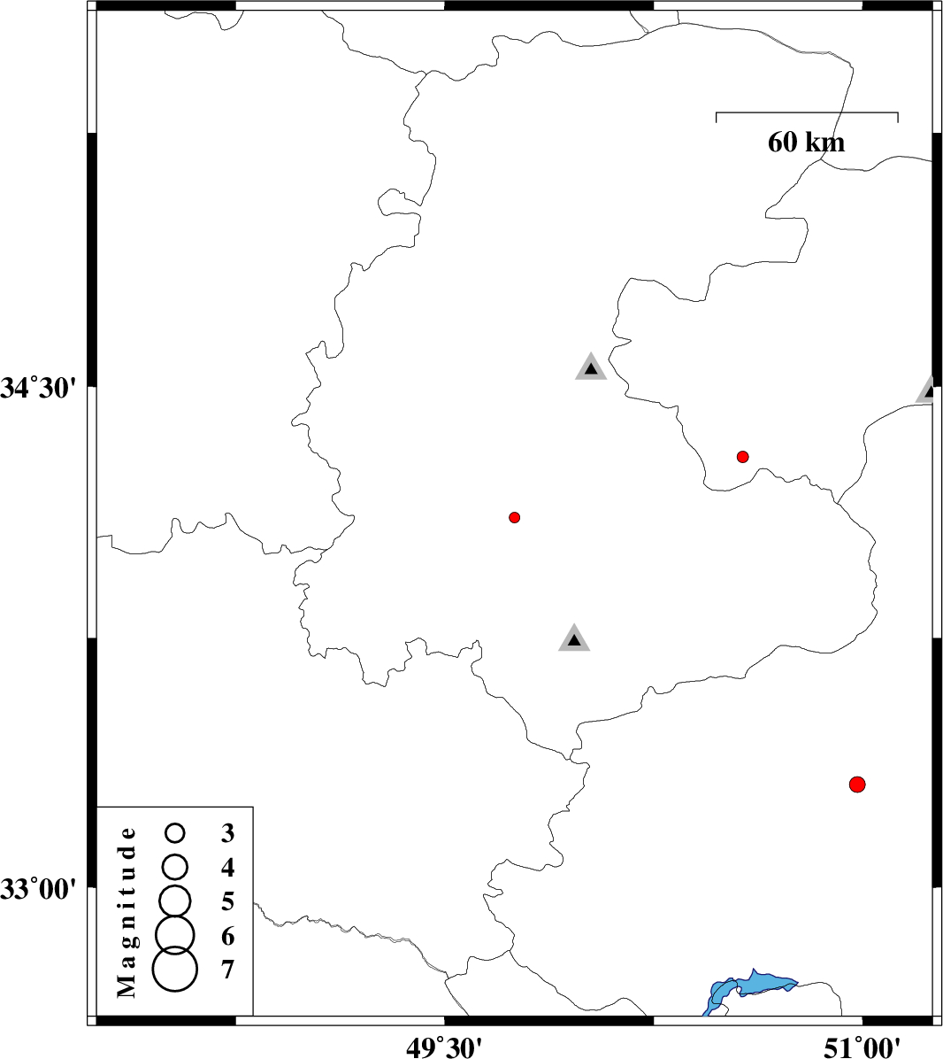 | 2013/05/20 | 09:46:55.1 | 14:16:55.1 | 34.11 | 49.75 | 27 | ML1.7 | Markazi Province, 6 km Arak |