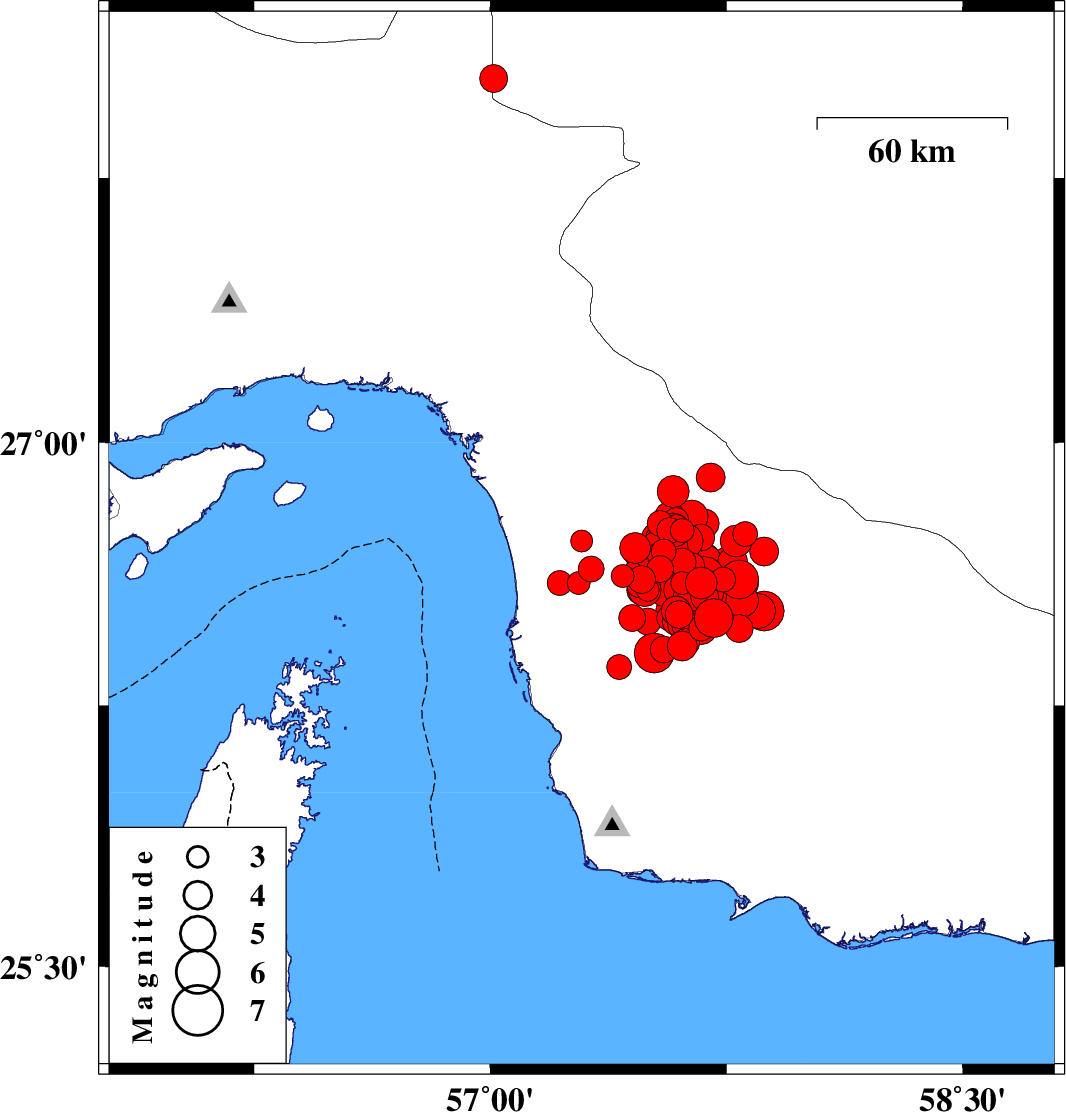 | 2013/05/11 | 03:09:48.1 | 07:39:48.1 | 26.52 | 57.87 | 15 | Ms5.7 | Hormozgan Province, 99 km North-East of Jask | ||