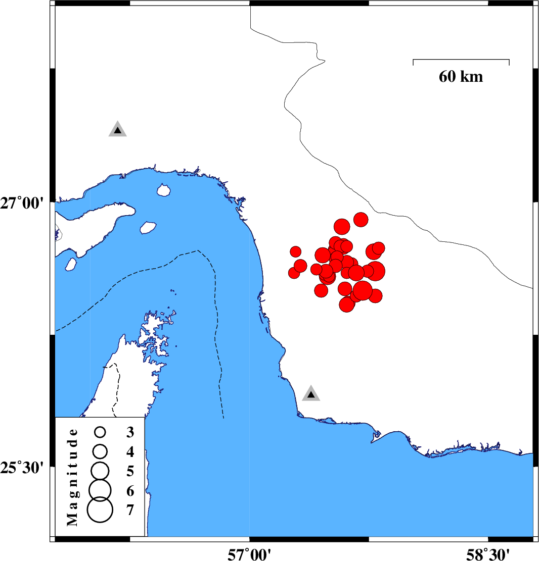 | 2013/05/13 | 05:44:27.6 | 10:14:27.6 | 26.47 | 57.79 | 15 | ML4 | Hormozgan Province, 93 km North of Jask | ||
