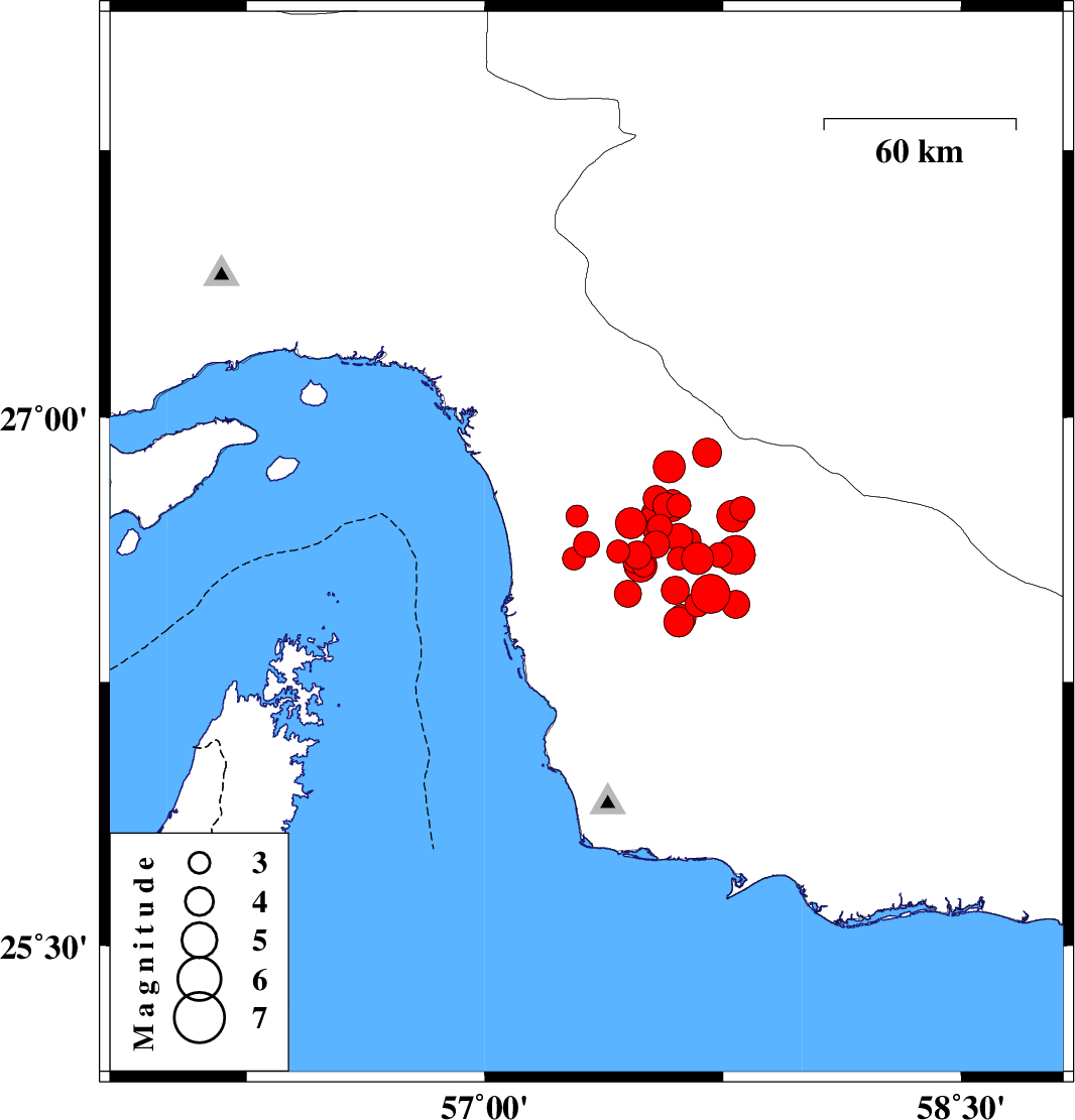 | 2013/05/14 | 04:25:35.1 | 08:55:35.1 | 26.47 | 57.67 | 18 | ML3.5 | Hormozgan Province, 94 km North of Jask | ||