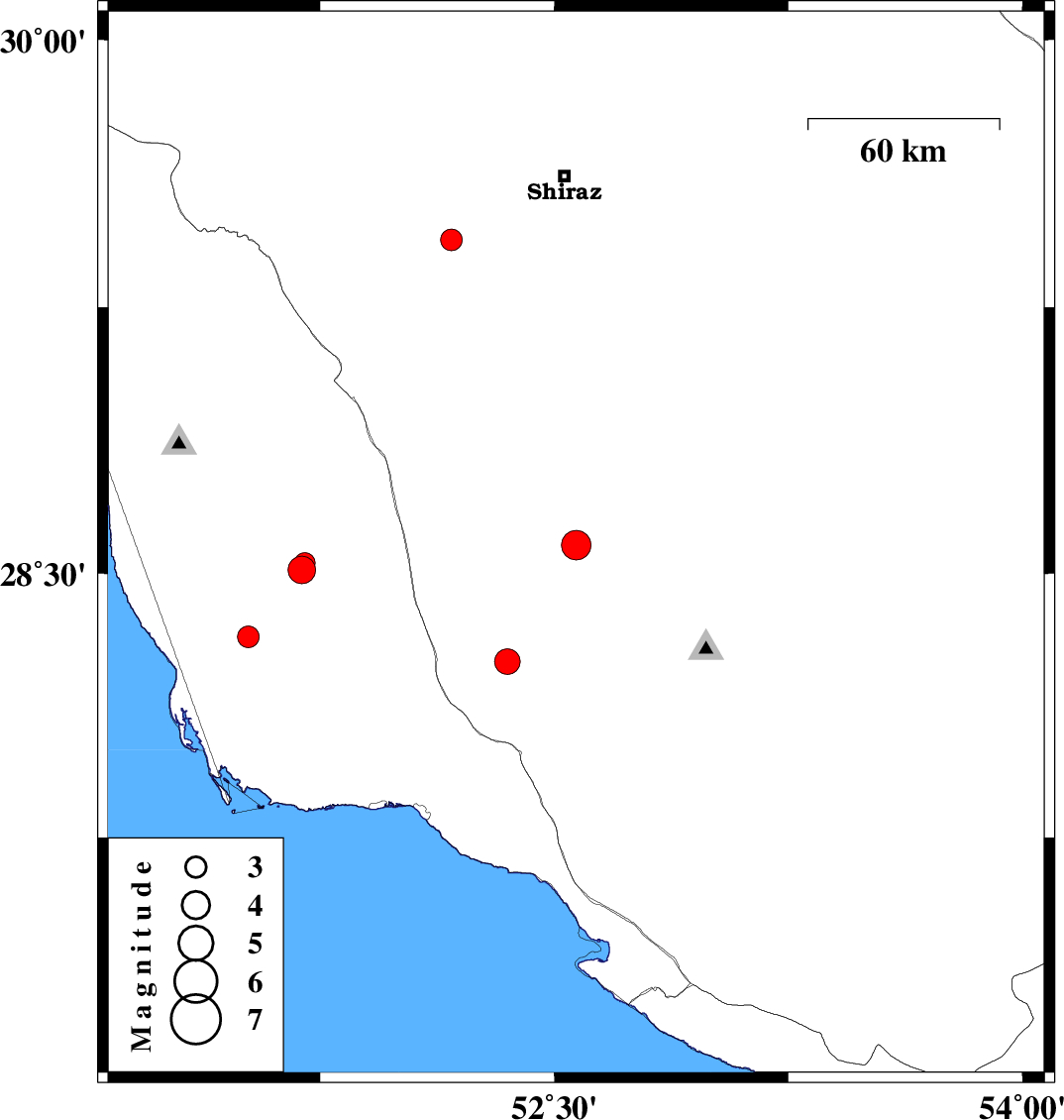 | 2013/05/16 | 07:16:48.3 | 11:46:48.3 | 28.51 | 51.69 | 14 | ML4 | Bushehr Province, 35 km South-East of Khormog | ||
