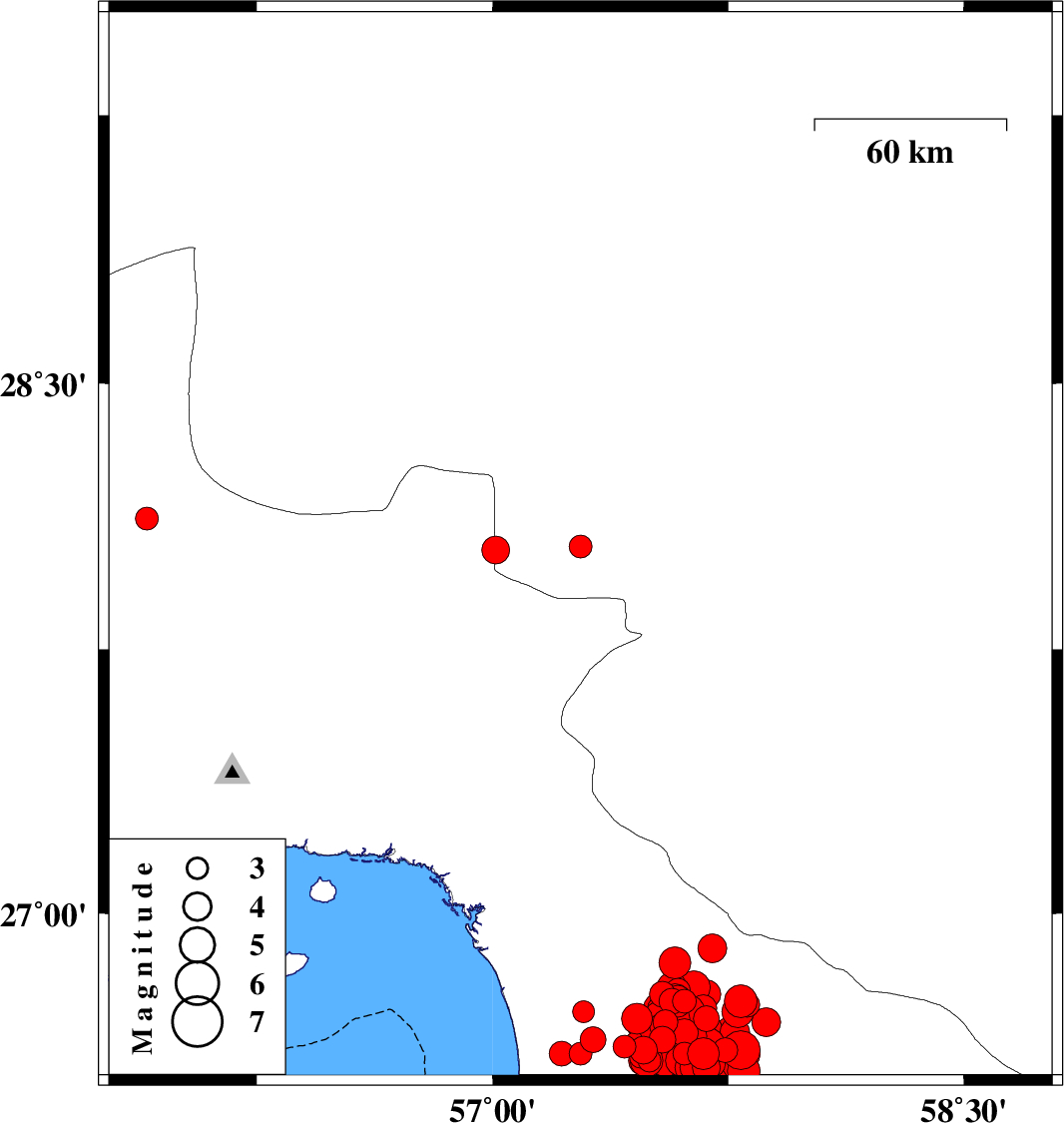 | 2013/04/25 | 07:48:58.5 | 12:18:58.5 | 28.03 | 57.01 | 14 | ML3.9 | Kerman Province, 68 km West of Kahnuj |