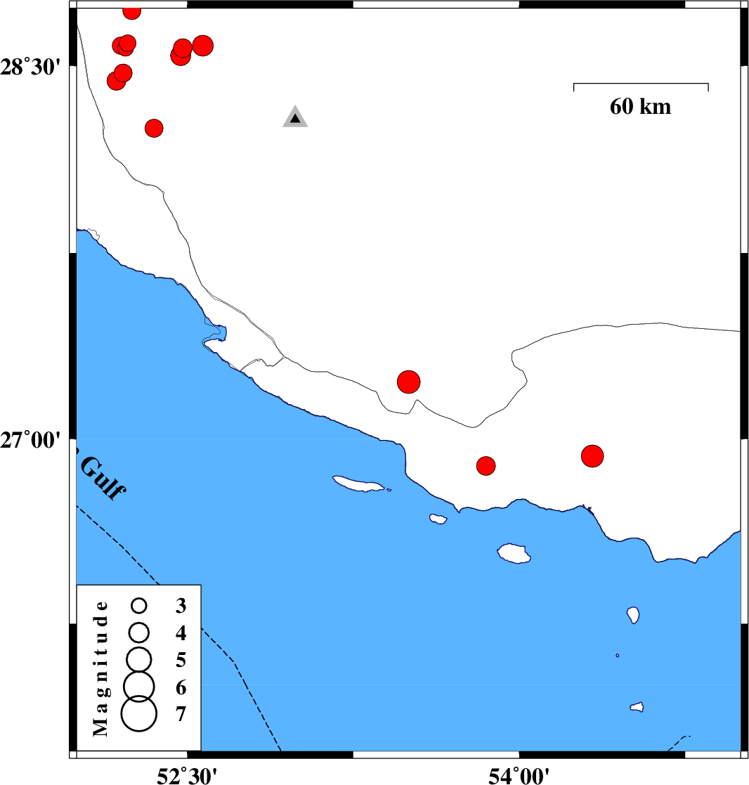 | 2013/04/28 | 12:11:31.3 | 16:41:31.3 | 26.93 | 54.33 | 14 | ML4.5 | Hormozgan Province, 30 km South of Bastak | ||