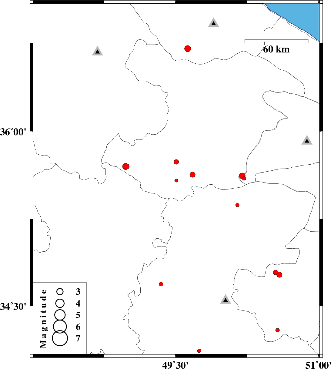 | 2013/05/02 | 09:20:16.6 | 13:50:16.6 | 35.37 | 50.15 | 14 | ML1.7 | Markazi Province, 45 km South of Buinzara | ||