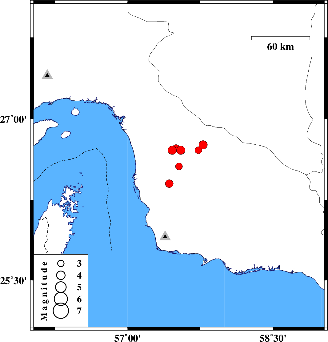 | 2013/05/26 | 00:28:34.2 | 04:58:34.2 | 26.73 | 57.5 | 15 | ML3.2 | Hormozgan Province, 76 km South of Manujan |