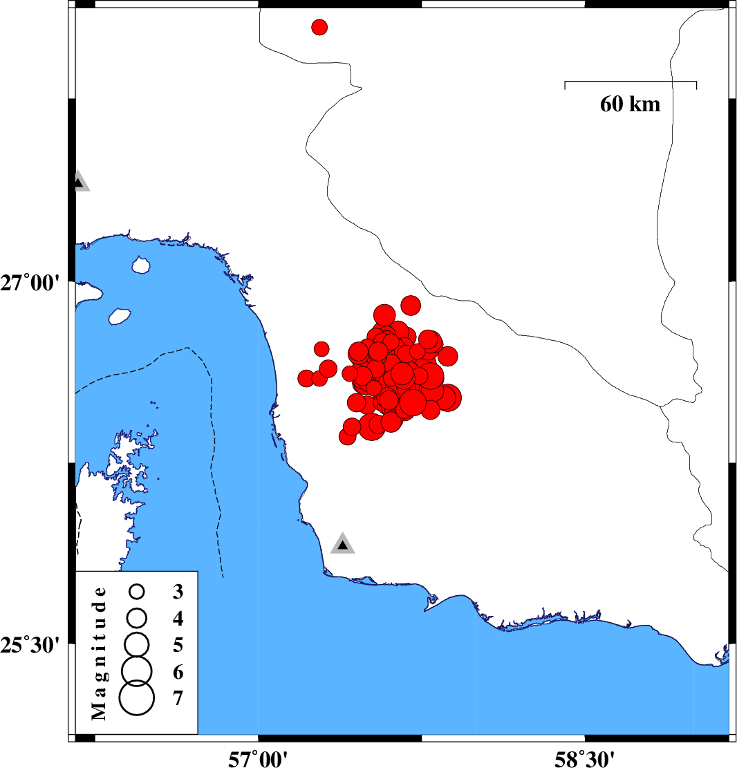 | 2013/05/11 | 03:09:48.1 | 07:39:48.1 | 26.52 | 57.87 | 15 | Ms5.7 | Hormozgan Province, 99 km North-East of Jask | ||