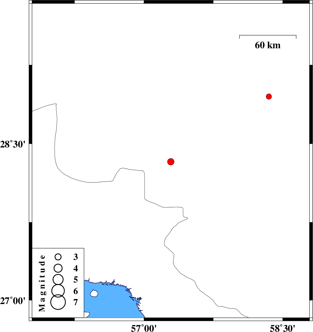 | 2013/06/01 | 02:02:27.7 | 06:32:27.7 | 28.95 | 58.35 | 14 | ML2.7 | Kerman Province, 18 km South of Bam |