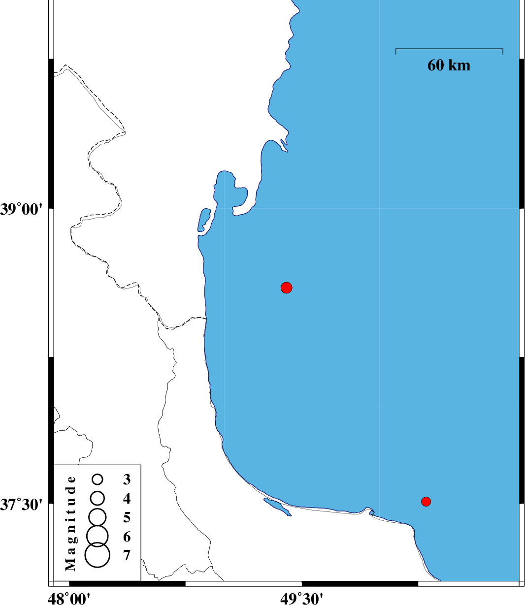 | 2013/05/15 | 08:57:48.2 | 13:27:48.2 | 37.51 | 50.3 | 14 | ML2.7 | Caspian Sea, 41 km North of Rudsar |