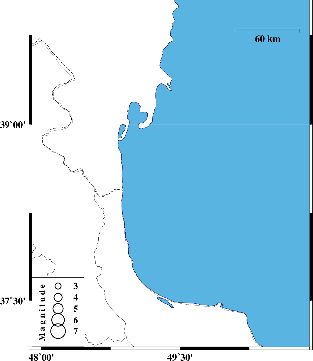 | 2013/06/04 | 19:58:19.1 | 00:28:19.1 | 38.6 | 49.4 | 14 | ML3.2 | Caspian Sea, 51 km North-East of Astara |