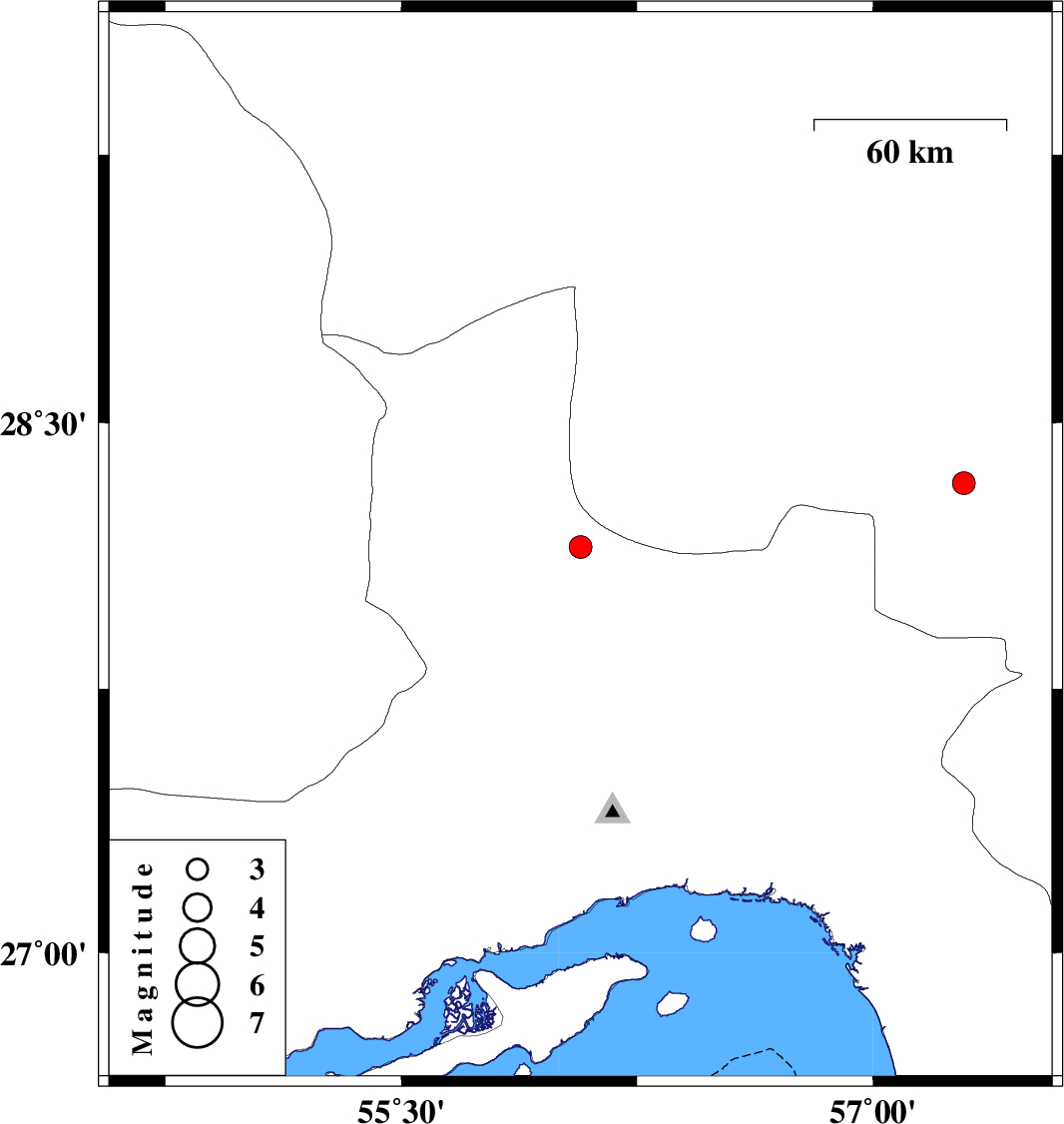 | 2013/06/07 | 19:06:14.2 | 23:36:14.2 | 28.15 | 56.07 | 14 | ML3.2 | Hormozgan Province, 24 km South-East of Hajiabad | ||