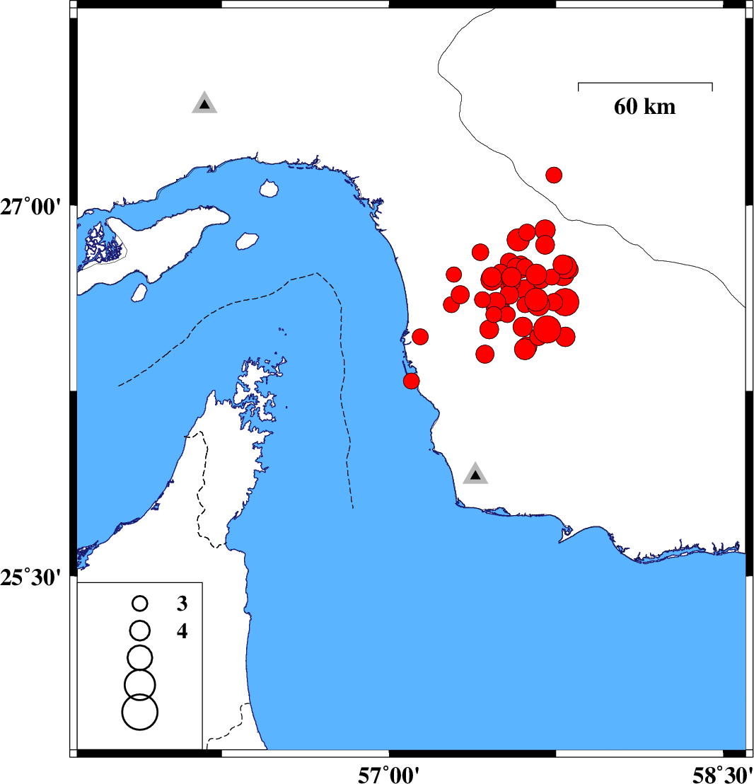 | 2013/06/12 | 06:35:05.7 | 11:05:05.7 | 26.29 | 57.1 | 15 | ML3.2 | Oman Sea, 96 km South of Minab | ||