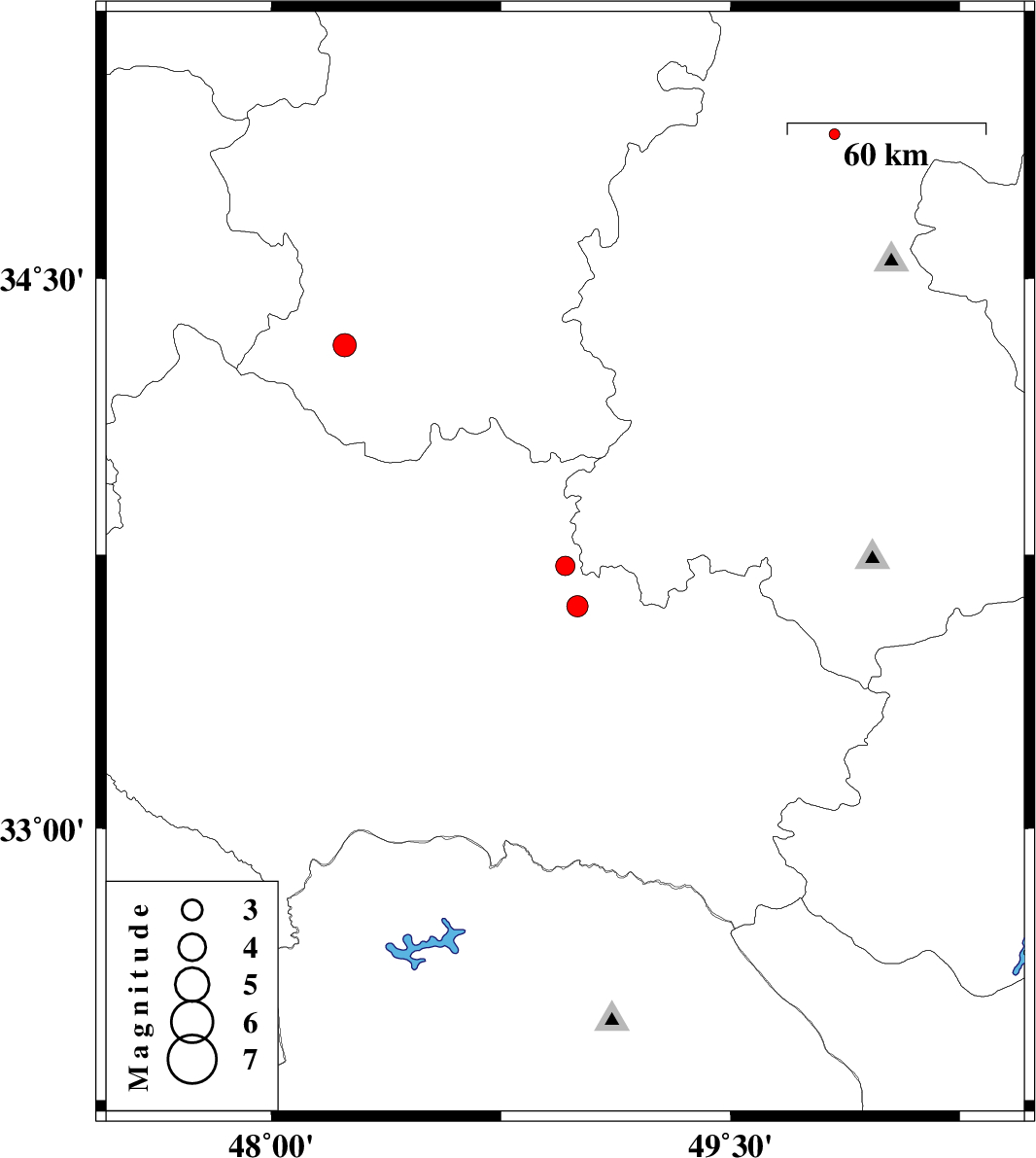 | 2013/06/17 | 02:36:16.0 | 07:06:16.0 | 33.72 | 48.96 | 11 | ML2.8 | Lorestan Province, 28 km North-West of Dorud | ||