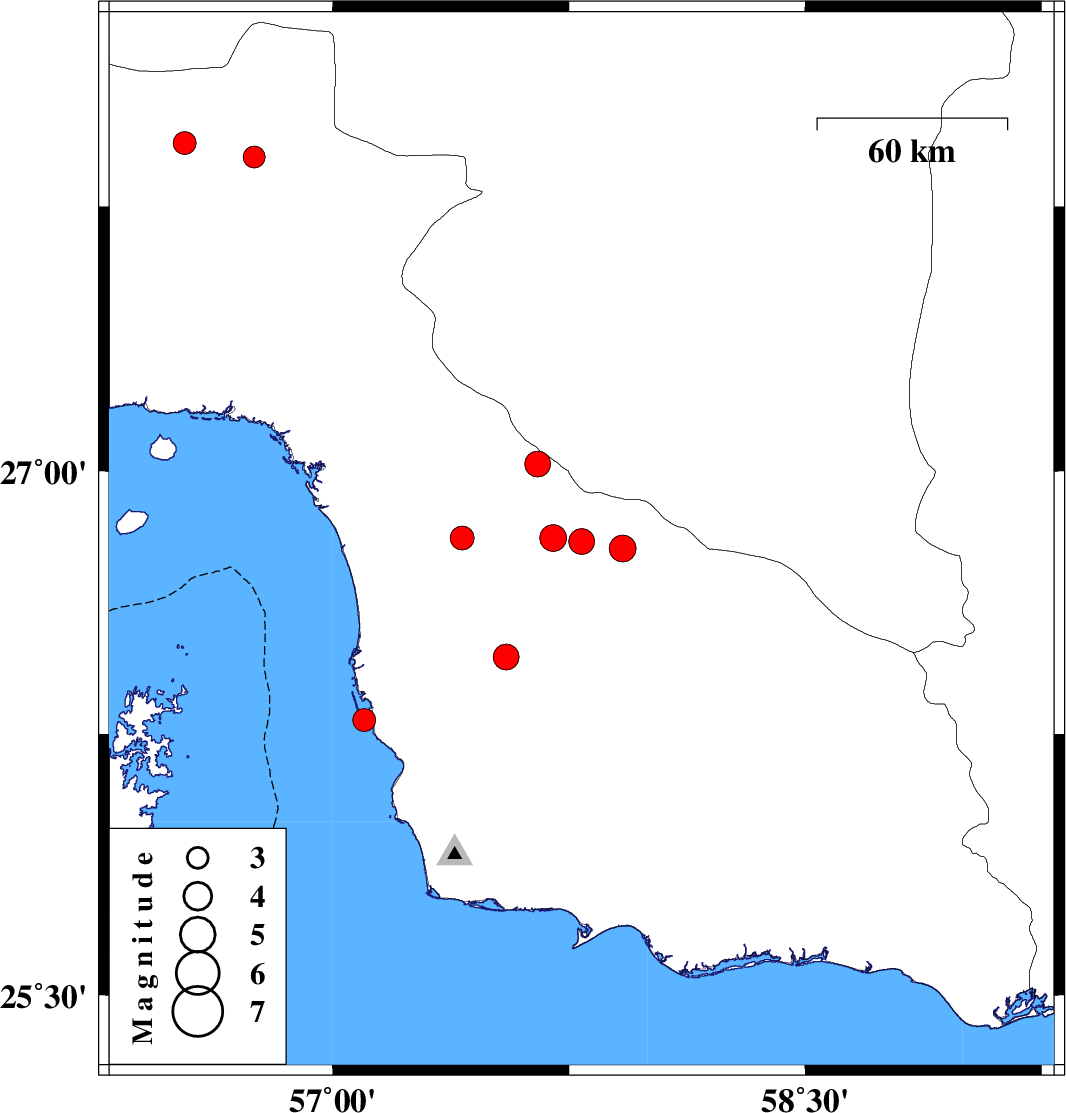 | 2013/06/12 | 06:35:05.7 | 11:05:05.7 | 26.29 | 57.1 | 15 | ML3.2 | Oman Sea, 96 km South of Minab |