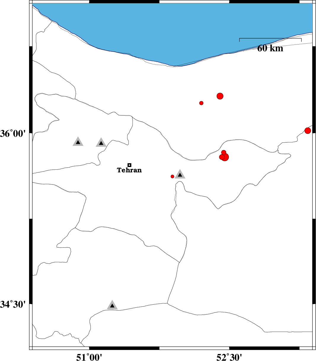 | 2013/06/20 | 11:38:13.4 | 16:08:13.4 | 36.32 | 52.4 | 14 | ML3.1 | Mazandaran Province, 17 km South of Amol | ||