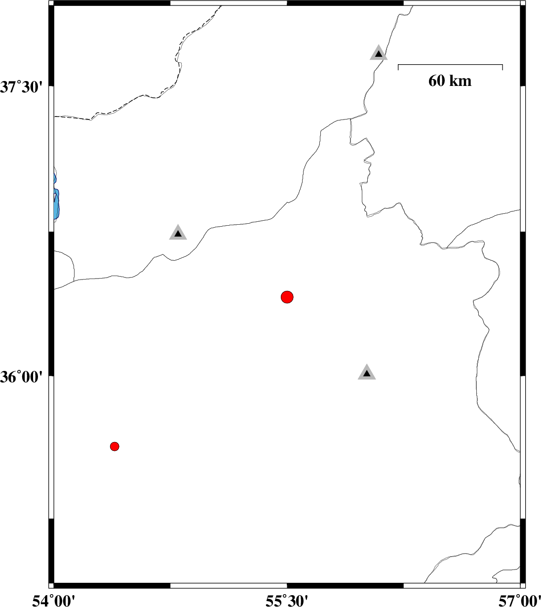 | 2013/06/23 | 23:58:51.8 | 04:28:51.8 | 36.41 | 55.5 | 14 | ML3.5 | Semnan Province, 47 km East of Shahrud | ||