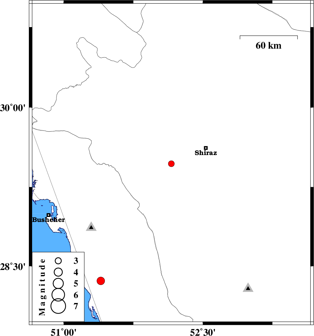 | 2013/06/30 | 22:01:46.3 | 02:31:46.3 | 29.47 | 52.16 | 14 | ML3 | Fars Province, 40 km South-West of Shiraz | ||