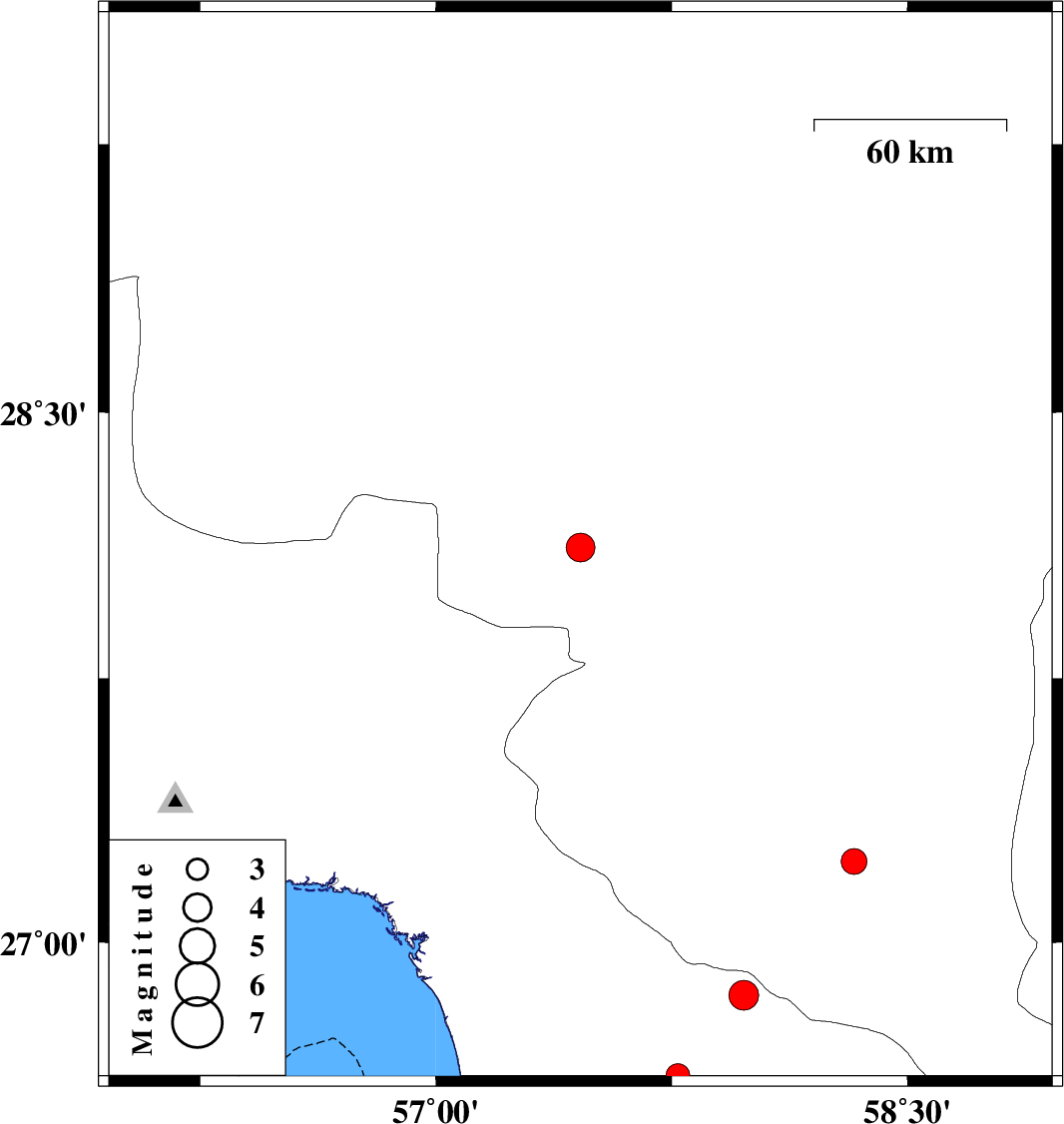 | 2013/06/30 | 04:24:04.3 | 08:54:04.3 | 27.23 | 58.33 | 15 | ML3.7 | Kerman Province, 85 km South-East of Manujan | ||