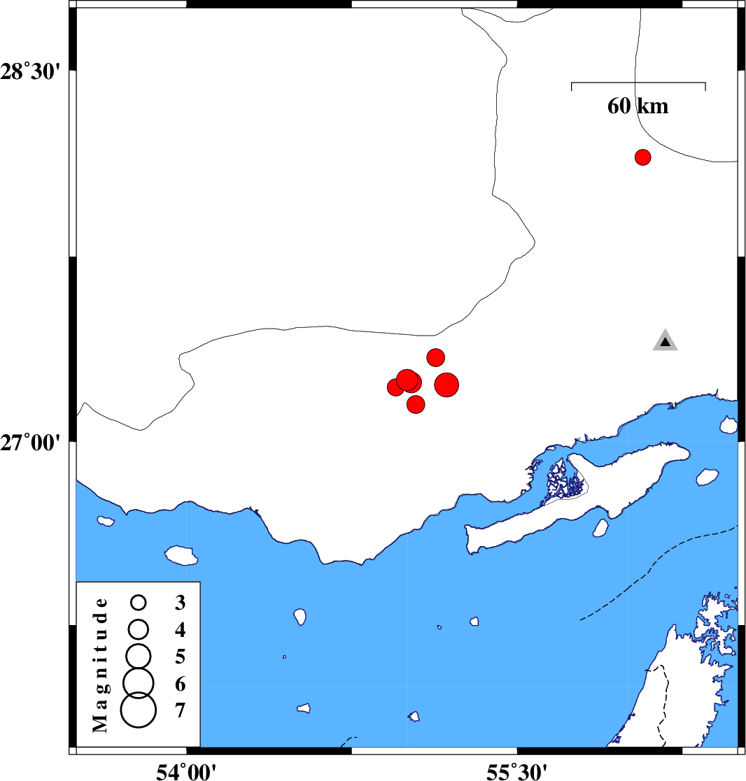 | 2013/06/07 | 19:06:14.2 | 23:36:14.2 | 28.15 | 56.07 | 14 | ML3.2 | Hormozgan Province, 24 km South-East of Hajiabad |