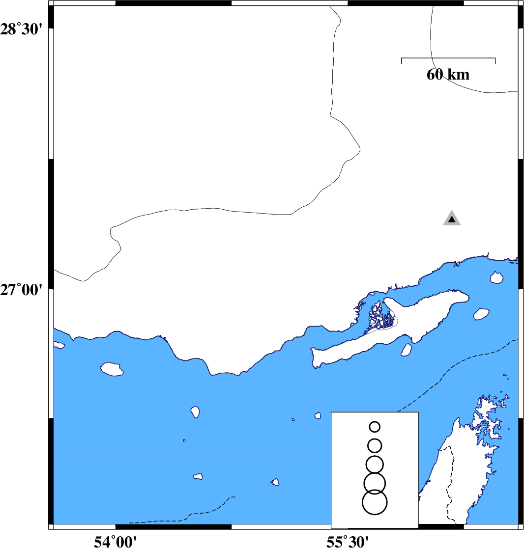 | 2013/07/02 | 16:04:42.4 | 20:34:42.4 | 27.15 | 55.04 | 14 | ML3.6 | Hormozgan Province, 67 km East of Bastak | ||