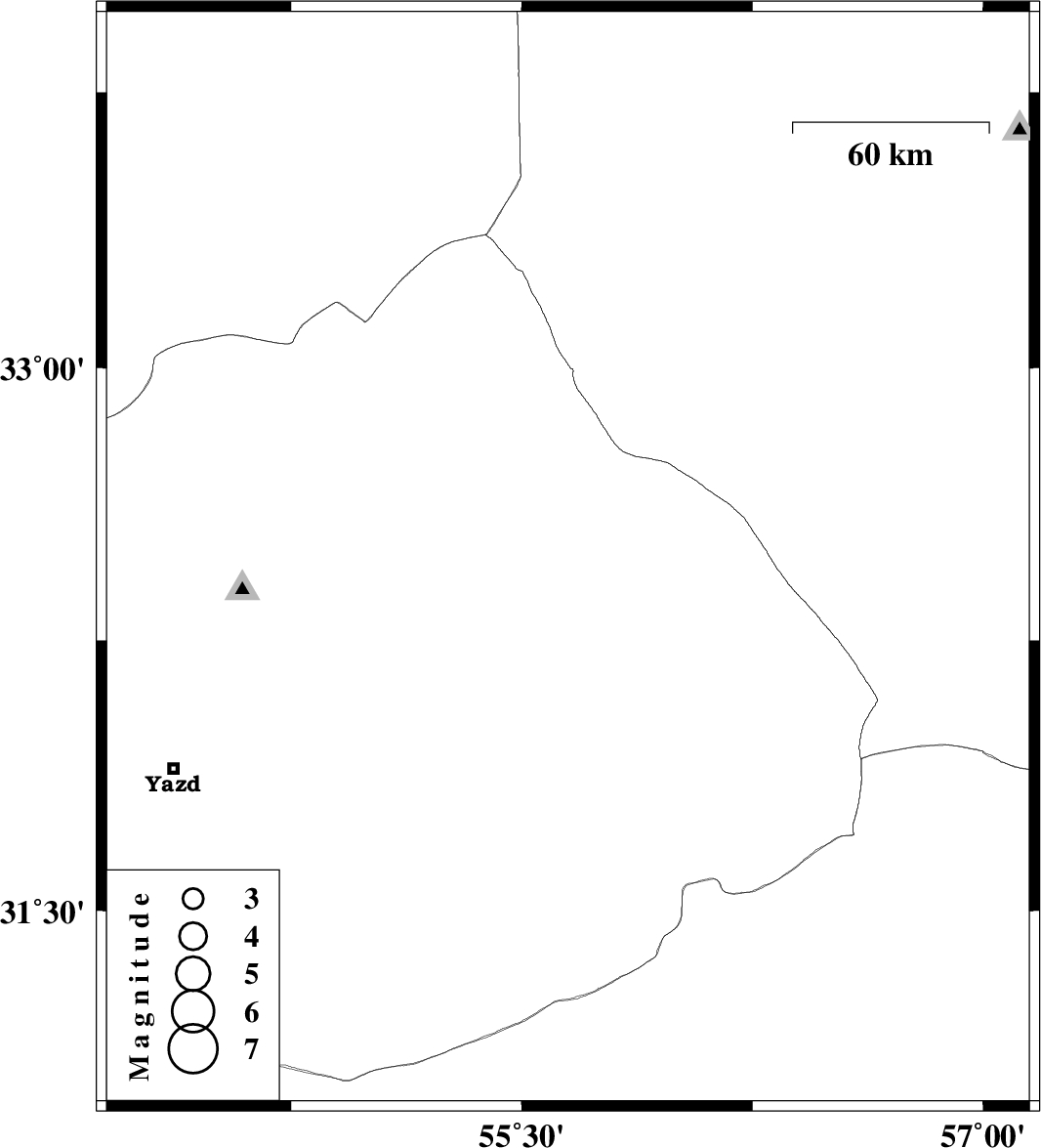 | 2013/07/09 | 01:26:32.9 | 05:56:32.9 | 32.47 | 55.65 | 15 | ML3.4 | Yazd Province, 100 km North-East of Bafq |