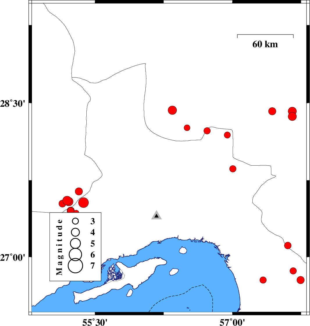 | 2013/07/02 | 16:04:42.4 | 20:34:42.4 | 27.15 | 55.04 | 14 | ML3.6 | Hormozgan Province, 67 km East of Bastak | ||