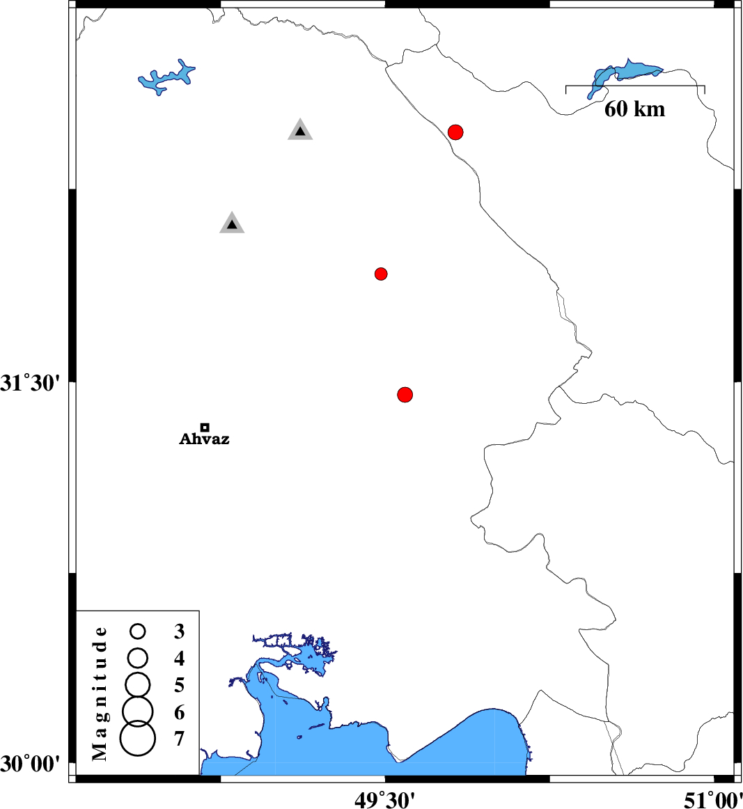 | 2013/07/12 | 19:13:08.7 | 23:43:08.7 | 31.45 | 49.59 | 14 | ML3.1 | Khoozestan Province, 20 km North of Ramhormoz | ||