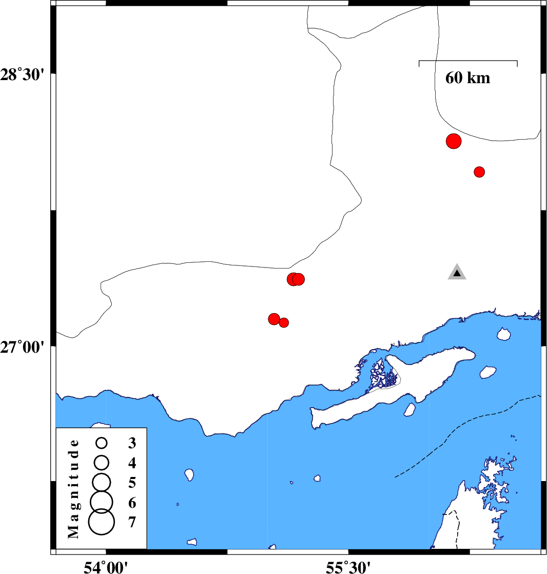 | 2013/07/12 | 21:23:13.8 | 01:53:13.8 | 27.37 | 55.19 | 14 | ML3.4 | Hormozgan Province, 84 km North-East of Bastak | ||