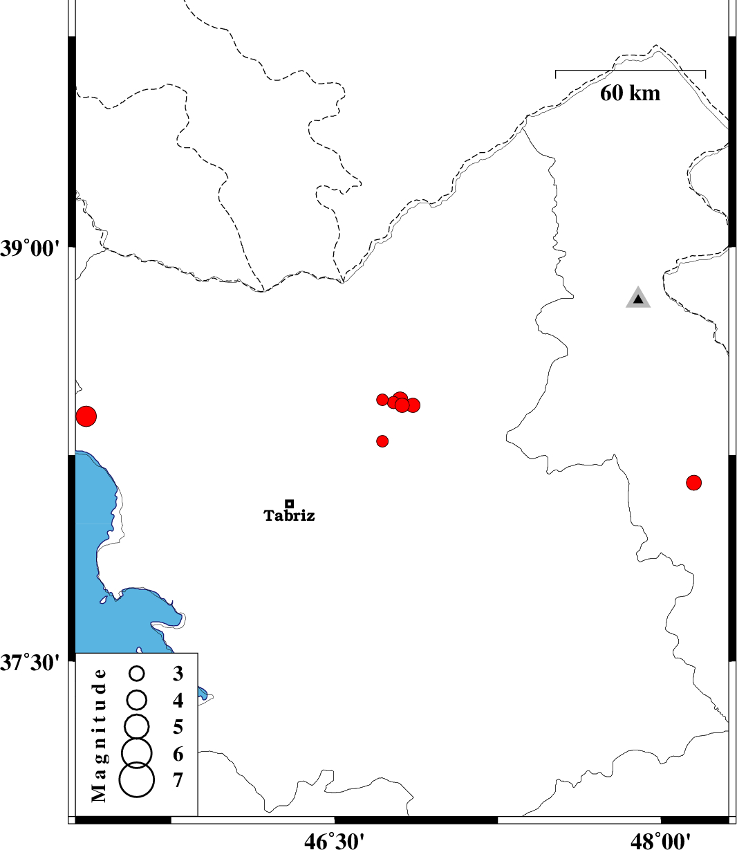 | 2013/07/13 | 04:06:29.7 | 08:36:29.7 | 38.43 | 46.81 | 14 | ML3 | Azarbaijan Sharghi Province, 24 km West of Ahar | ||