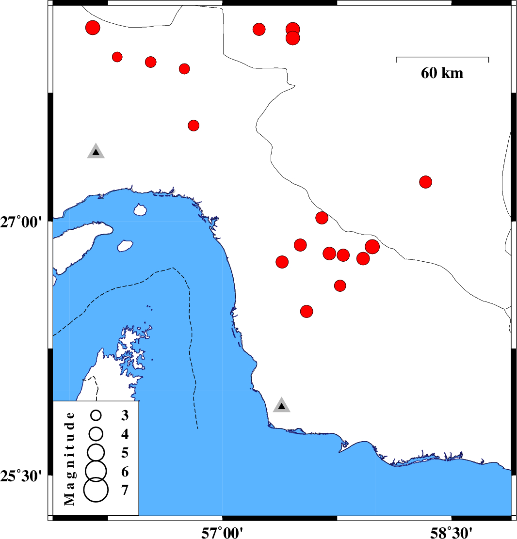 | 2013/06/16 | 03:11:58.2 | 07:41:58.2 | 26.47 | 57.55 | 15 | ML3.7 | Hormozgan Province, 105 km South of Manujan |