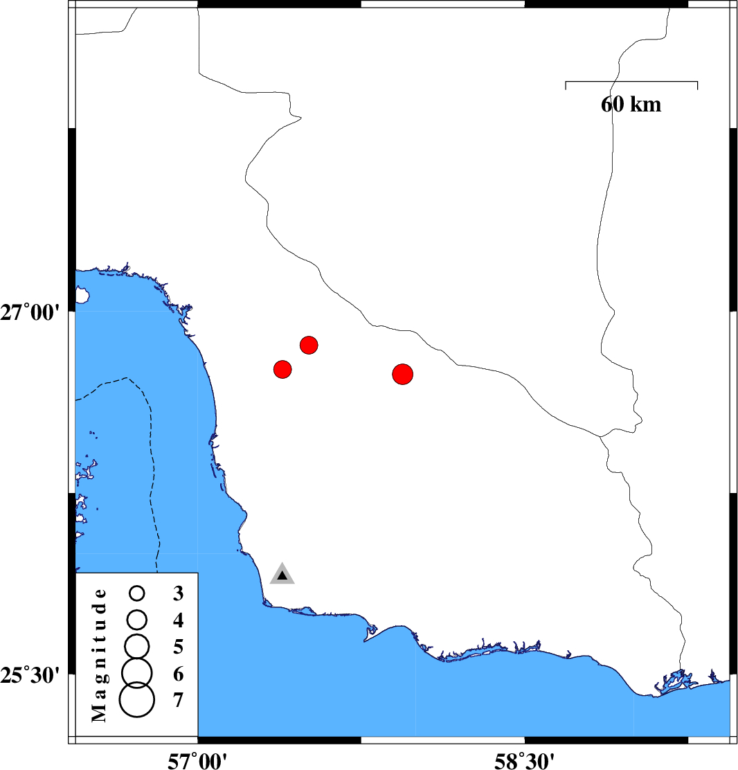 | 2013/07/17 | 11:55:29.1 | 16:25:29.1 | 26.74 | 57.94 | 17 | ML4.3 | Hormozgan Province, 86 km South-East of Manujan | ||