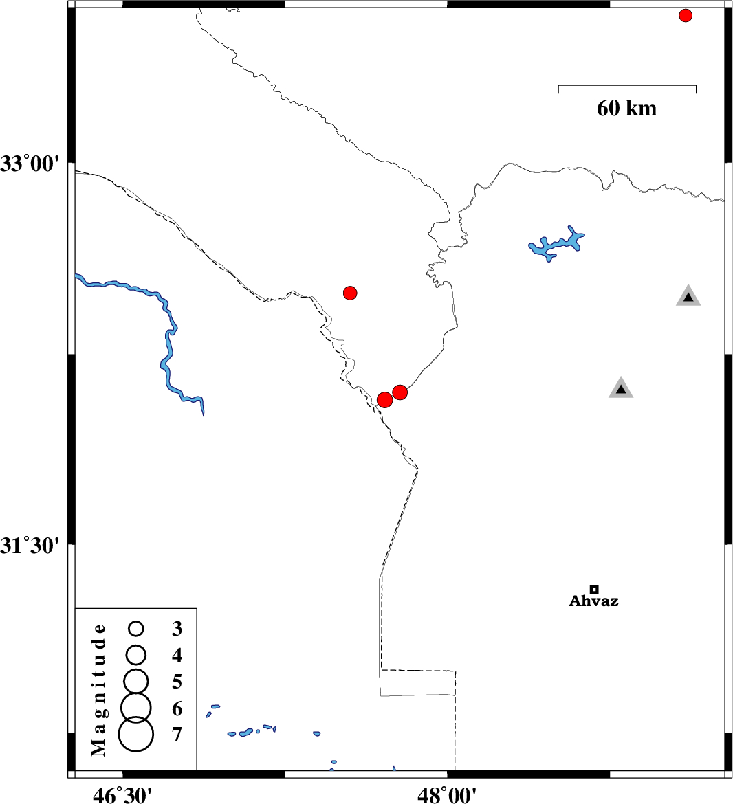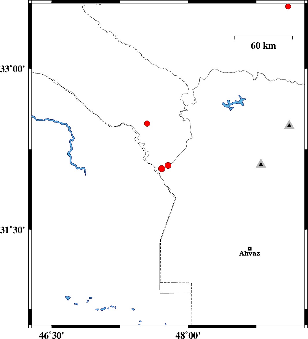 | 2013/07/18 | 00:42:41.8 | 05:12:41.8 | 32.07 | 47.71 | 14 | ML3.3 | Khoozestan Province, 53 km South-West of Shush | ||