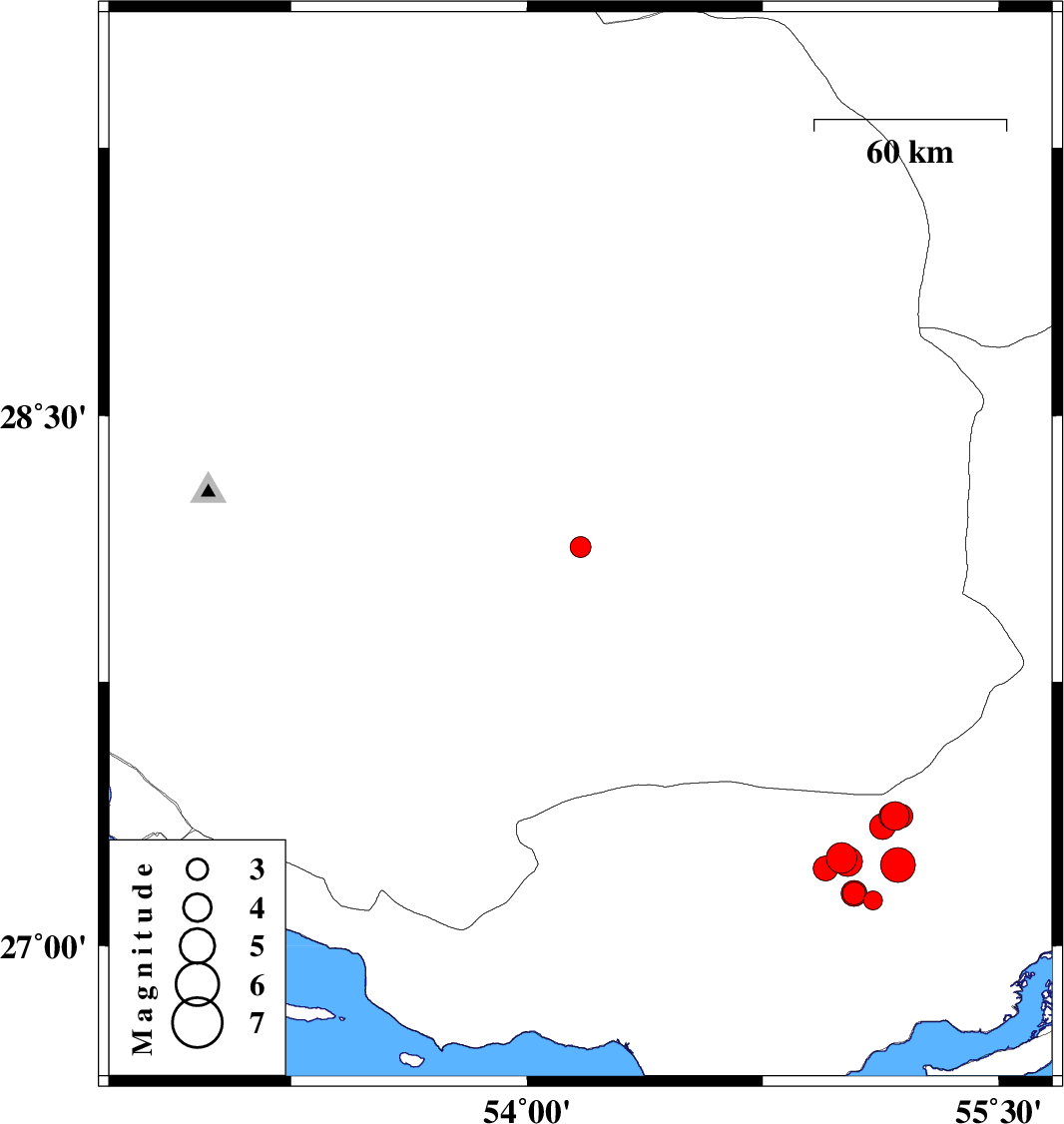 | 2013/07/02 | 16:04:42.4 | 20:34:42.4 | 27.15 | 55.04 | 14 | ML3.6 | Hormozgan Province, 67 km East of Bastak | ||