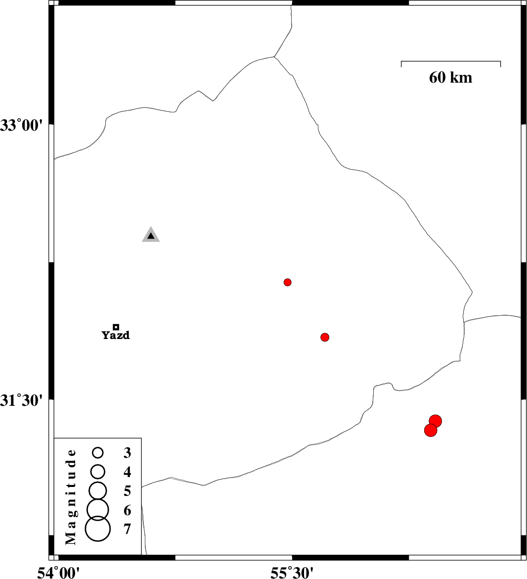 | 2013/07/26 | 11:40:32.1 | 16:10:32.1 | 32.14 | 55.47 | 14 | ML2.1 | Yazd Province, 60 km North of Bafq | ||