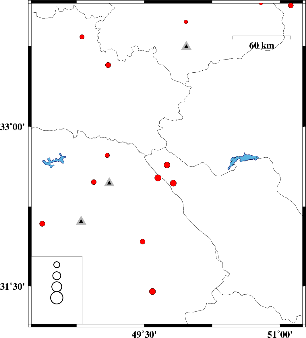 | 2013/07/18 | 09:40:16.2 | 14:10:16.2 | 33.97 | 49.96 | 9 | ML1.8 | Markazi Province, 28 km South-East of Arak | ||