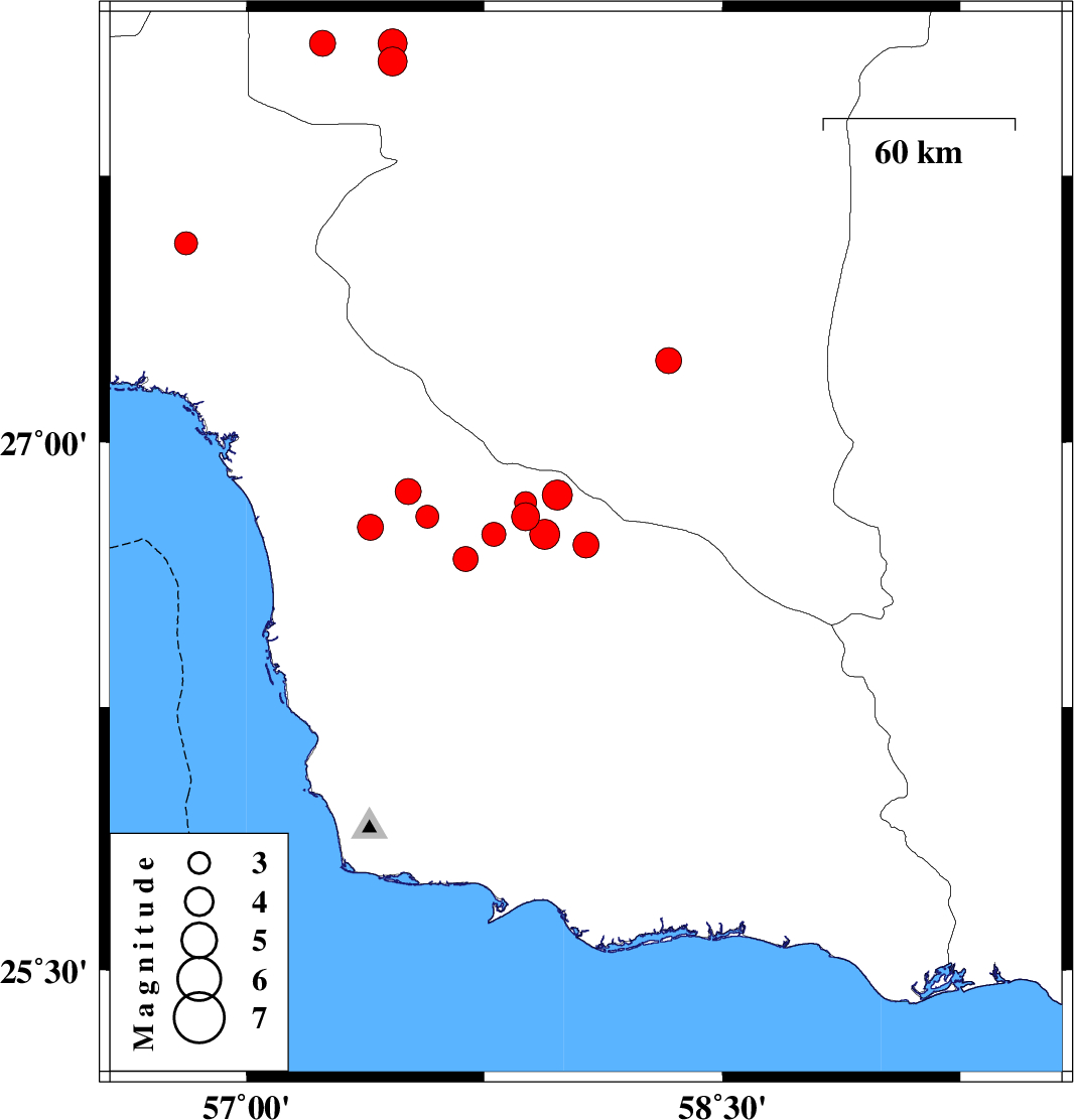 | 2013/07/02 | 01:33:42.7 | 06:03:42.7 | 28.07 | 57.46 | 15 | ML4.1 | Kerman Province, 27 km North-West of Kahnuj | ||