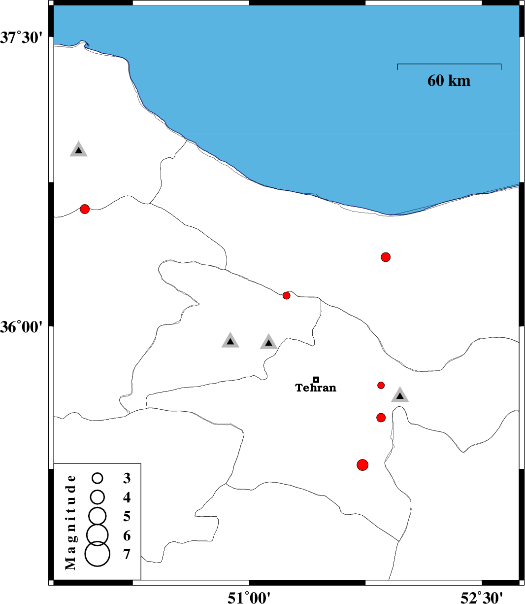 | 2013/07/30 | 10:19:38.2 | 14:49:38.2 | 35.69 | 51.85 | 18 | ML2 | Tehran Province, 20 km West of Damavand | ||